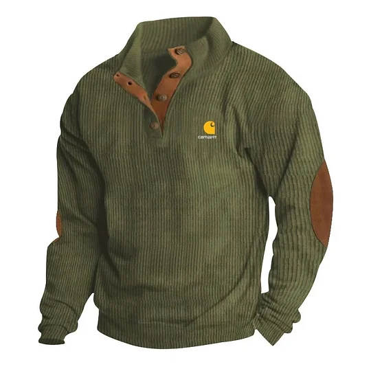 Details: Stand collar, quarter button, elbow panel design, kangaroo pocket;