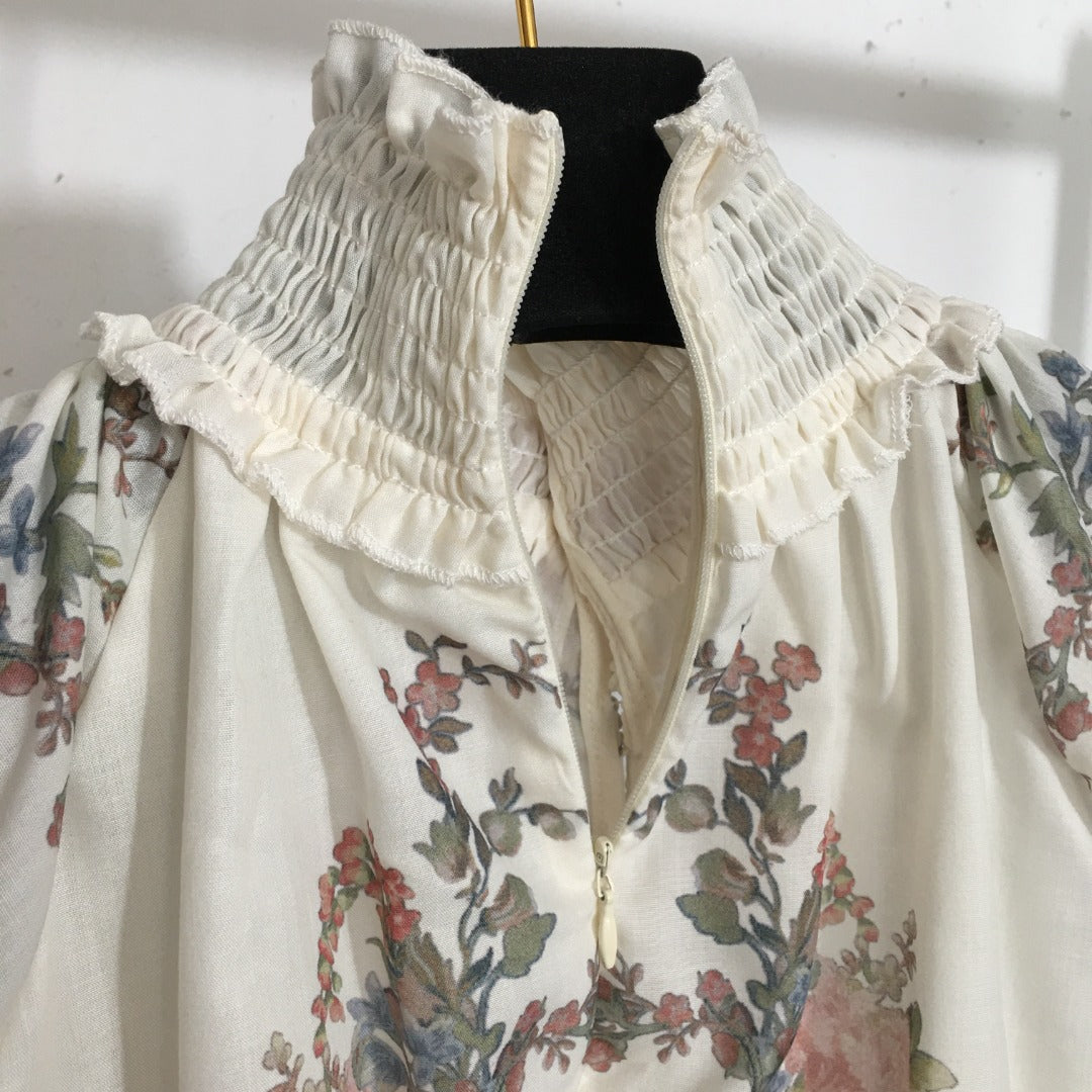 ZIM**** Linen colorful flower print lantern short-sleeved high-necked top + shorts with belt
