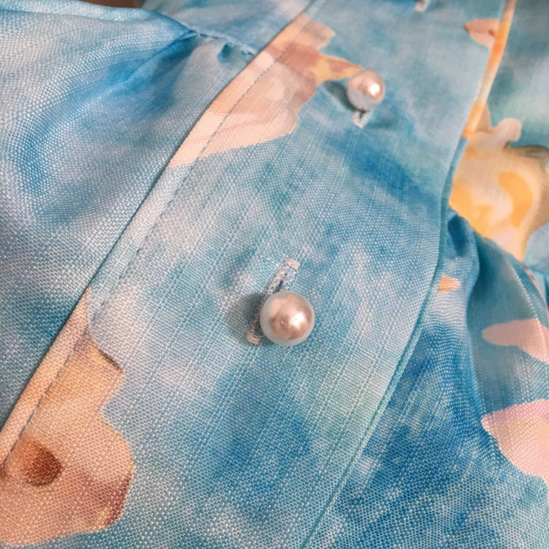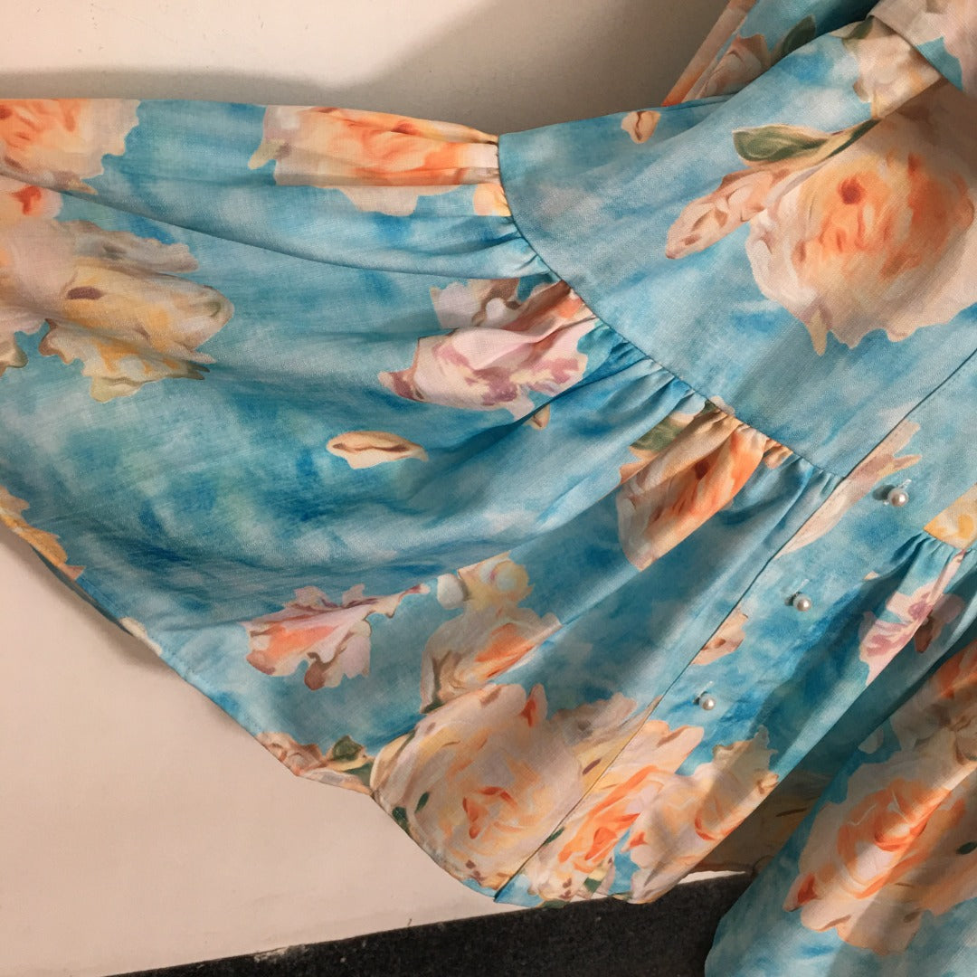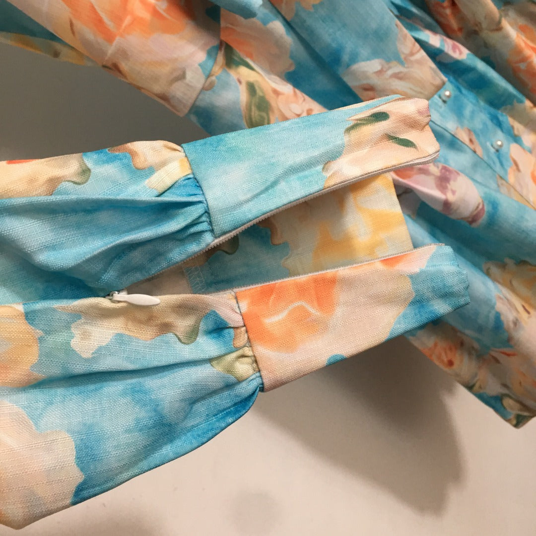 • ZIM**** New Pearl Button Temperament Large Flower Print Lace-up Waist Long Sleeve Dress