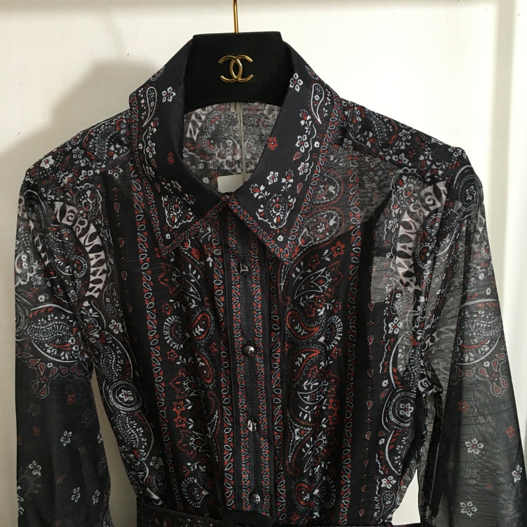 ZIM****-New suit, retro pattern linen print, lapel waist long sleeve dress, long skirt, with belt, suspender lining