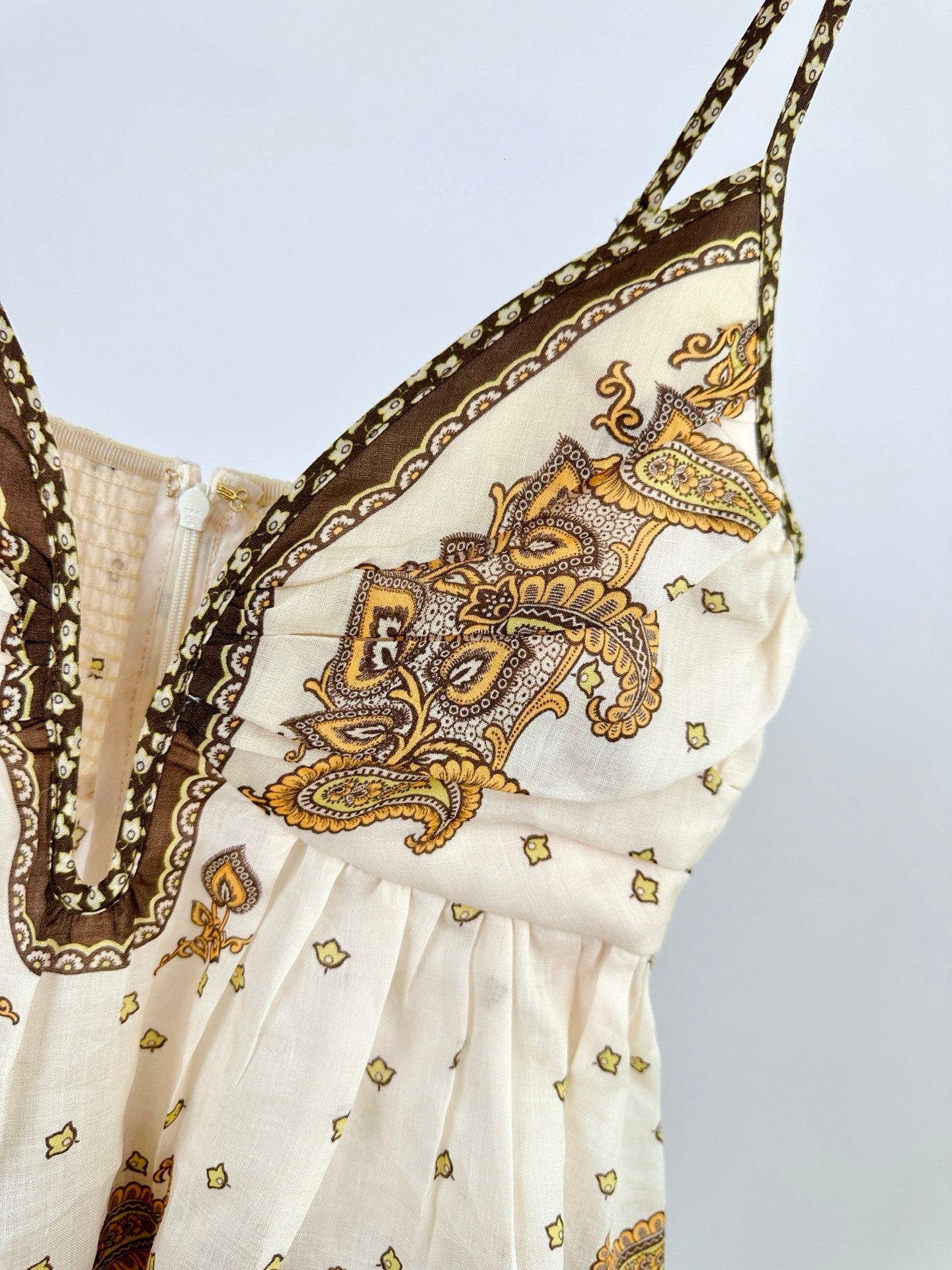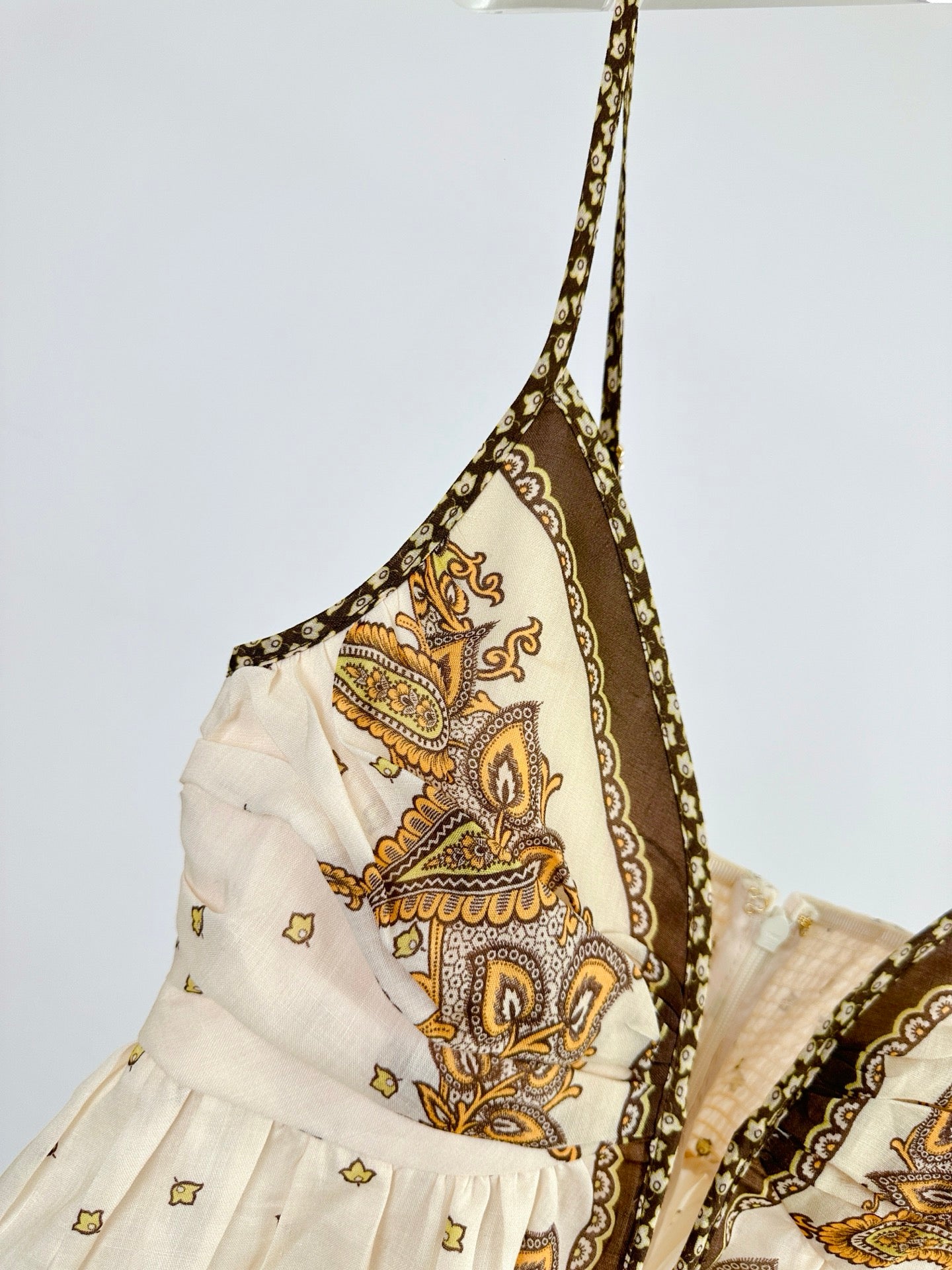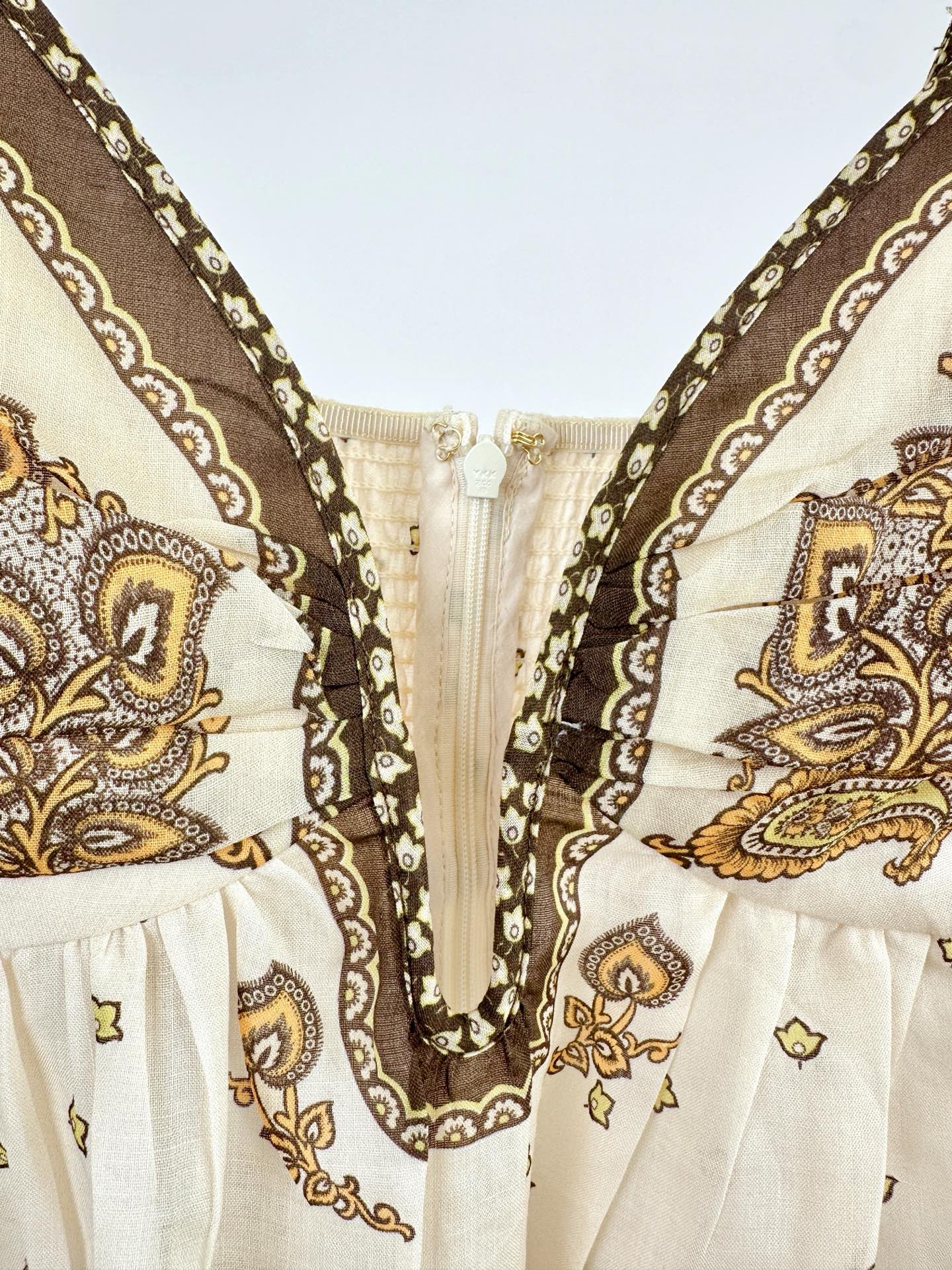 •Pleated center back with zipper