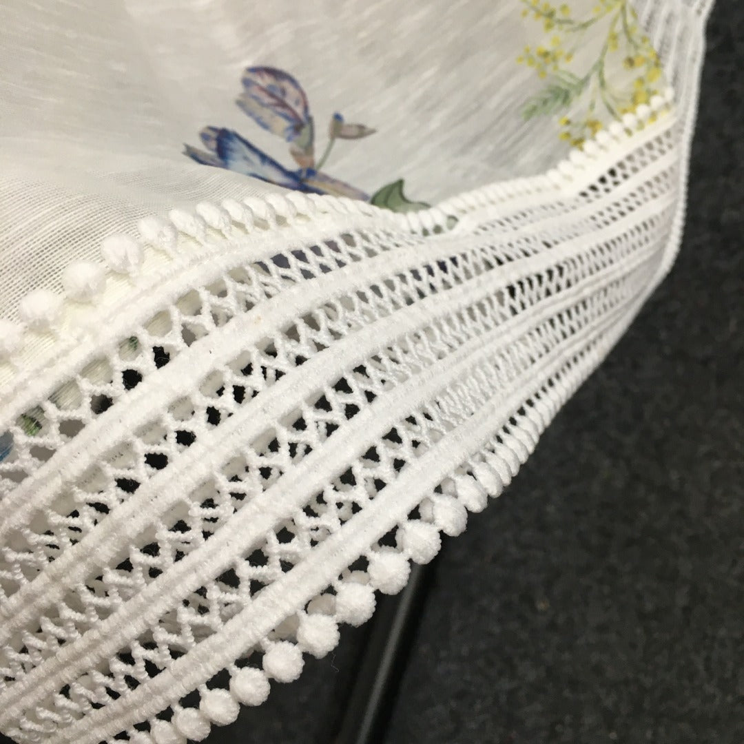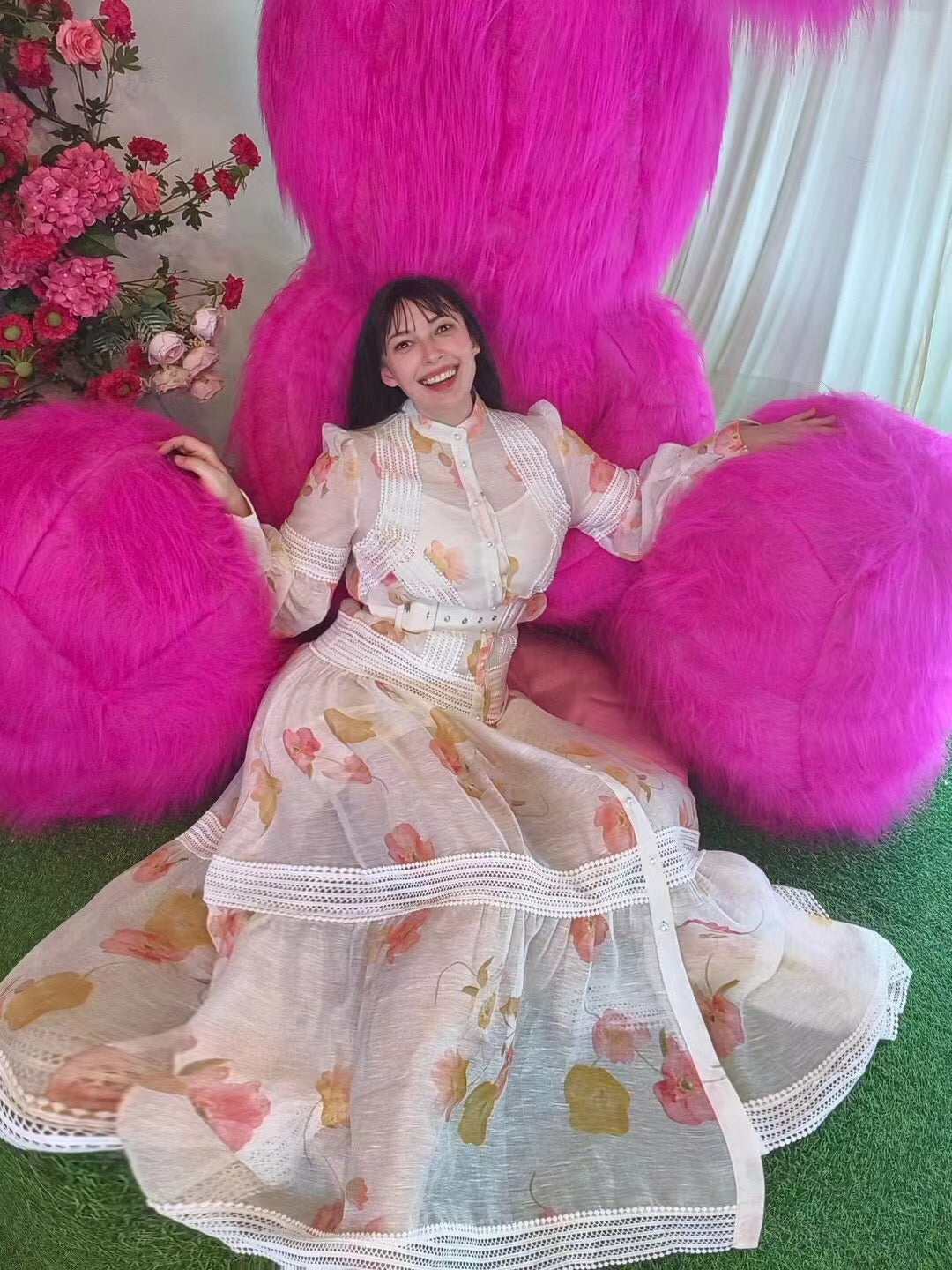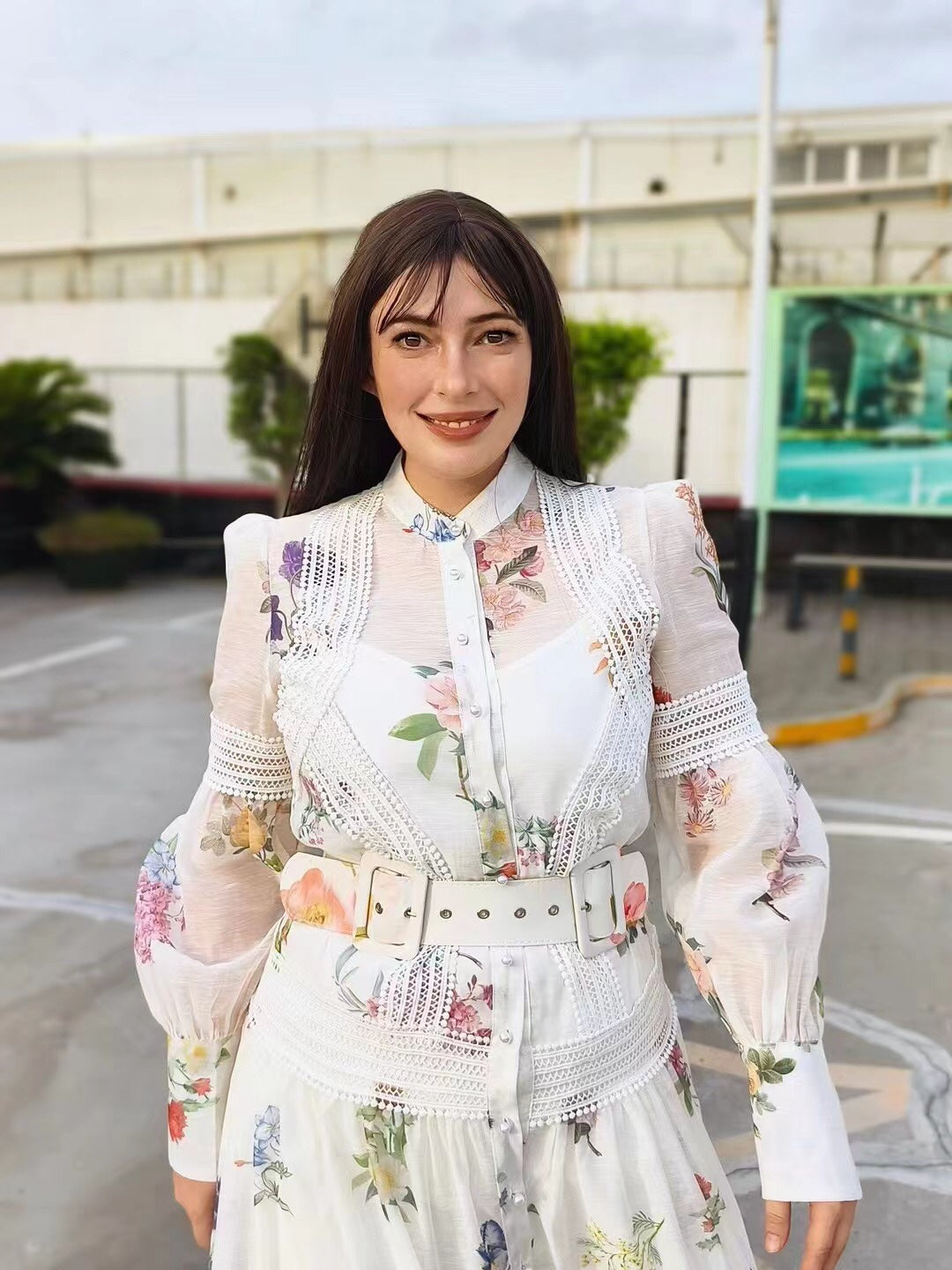 Zim** Linen colorful flower print Pearl button collar waist long sleeve dress with belt and suspender lining, white