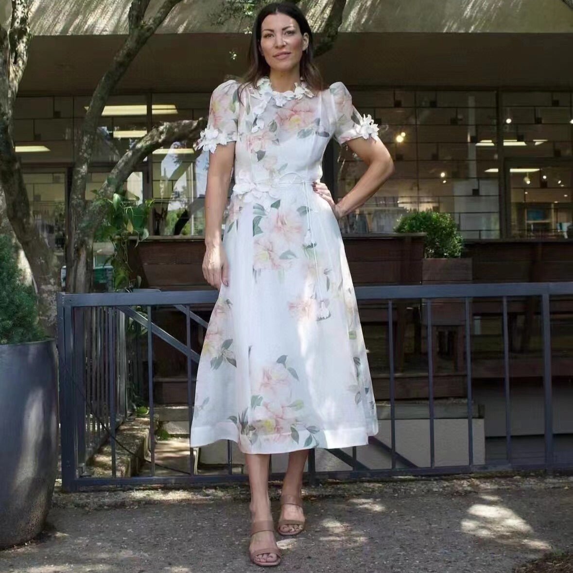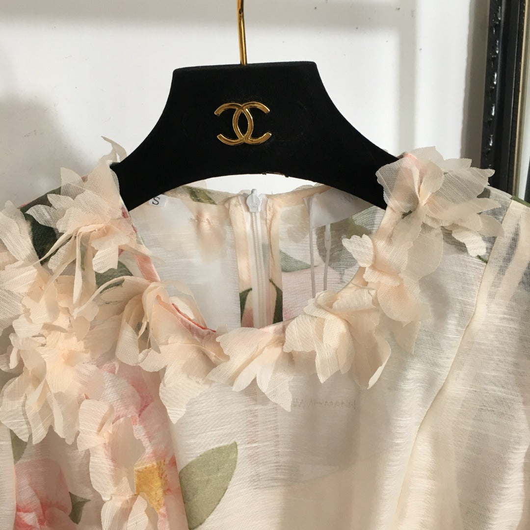 Zim** new three-dimensional flower decoration pink flower print tie waist short sleeve dress